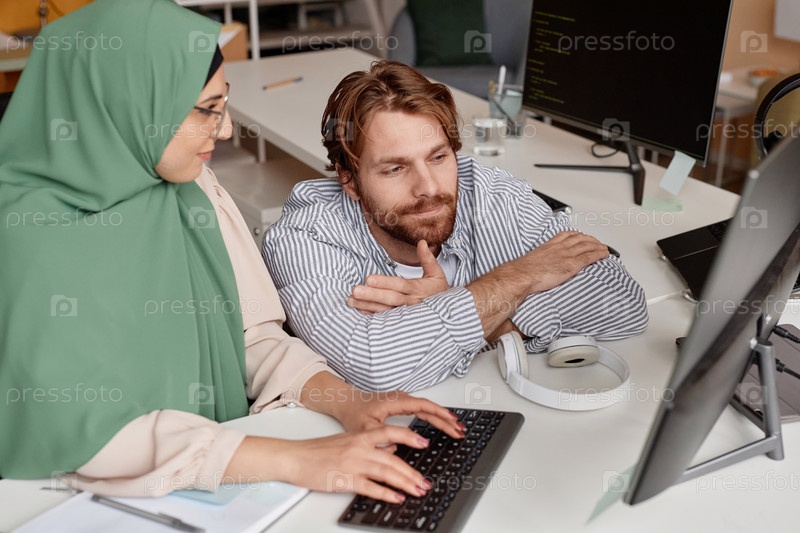 Человек разговаривает с коллегой в офисе и смотрит на компьютерный экран