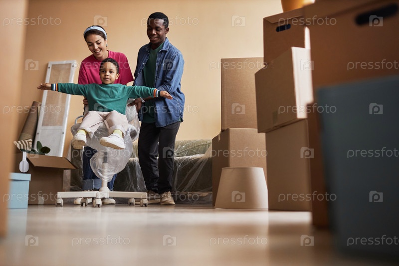 Веселая молодая межкультурная семья развлекается во время переезда