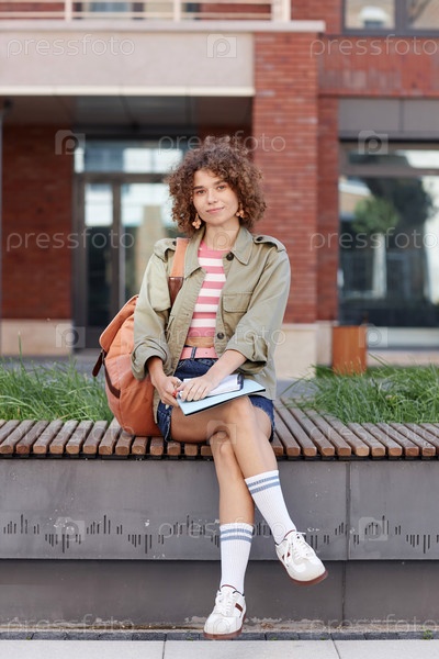 Молодая женщина как студентка, сидящая на улице в кампусе колледжа и улыбающаяся