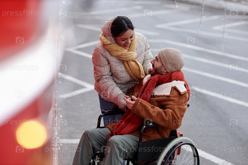 Романтическая молодая пара с мужчиной, пользующимся инвалидной коляской, наслаждается свиданием на свежем воздухе