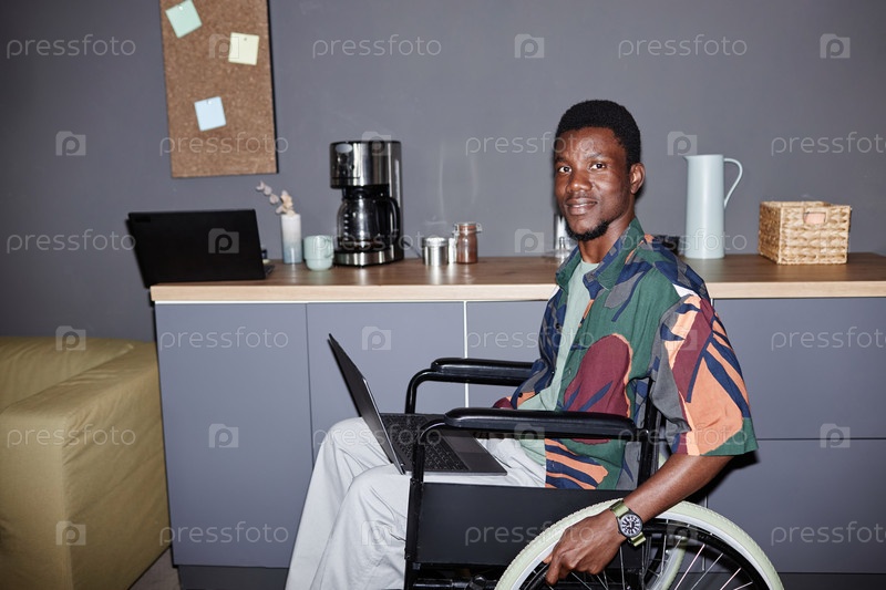 Чернокожий мужчина, пользующийся инвалидной коляской и улыбающийся на камеру в современном офисе с флэшем