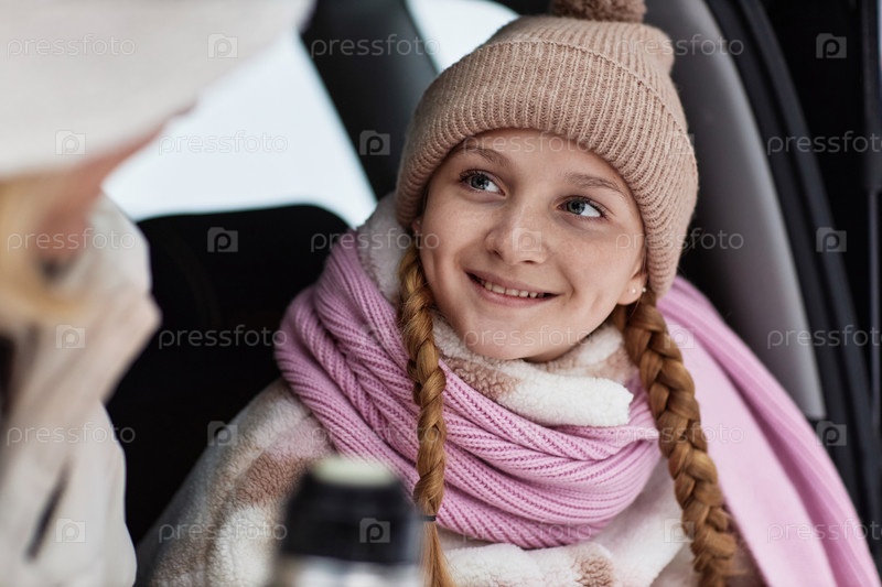 Сосредоточьтесь на счастливой очаровательной девочке в теплой зимней одежде, глядящей на свою мать