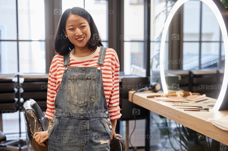 Откровенный парикмахер и улыбающийся, наслаждаясь работой в салоне красоты