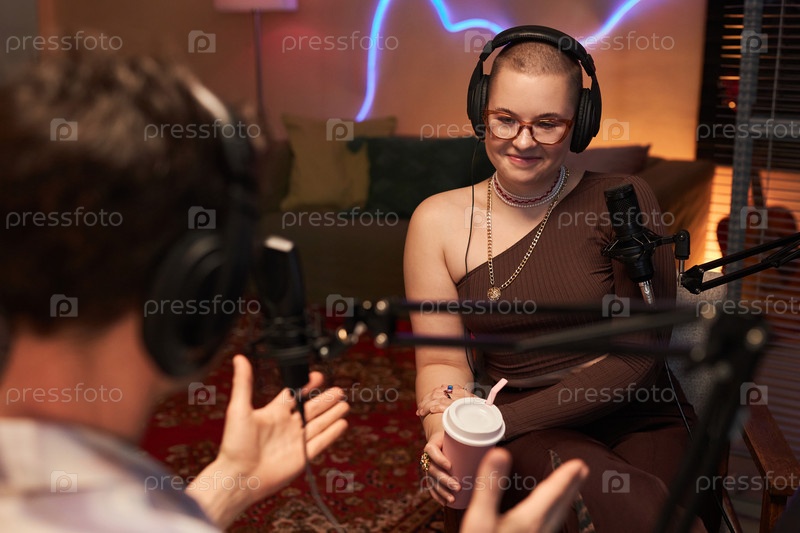 Улыбающаяся молодая женщина подкастер и гость