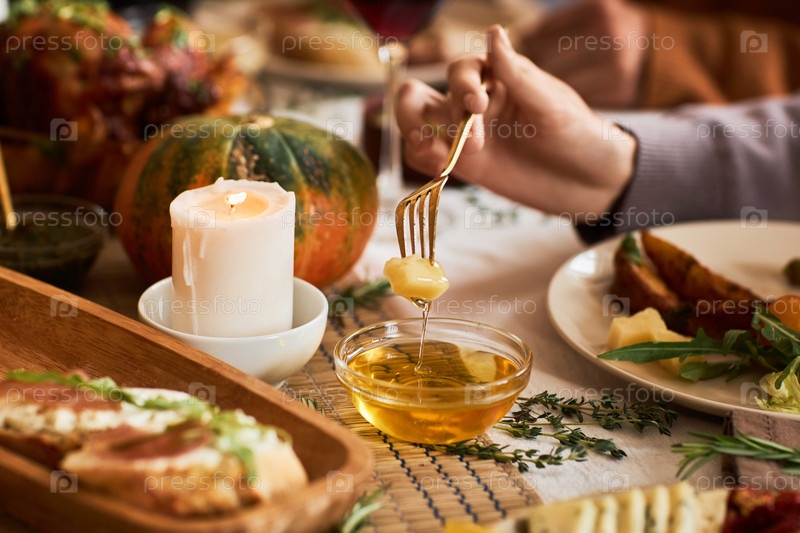 Близкий план молодой женщины, погружающей сыр в медовый соус