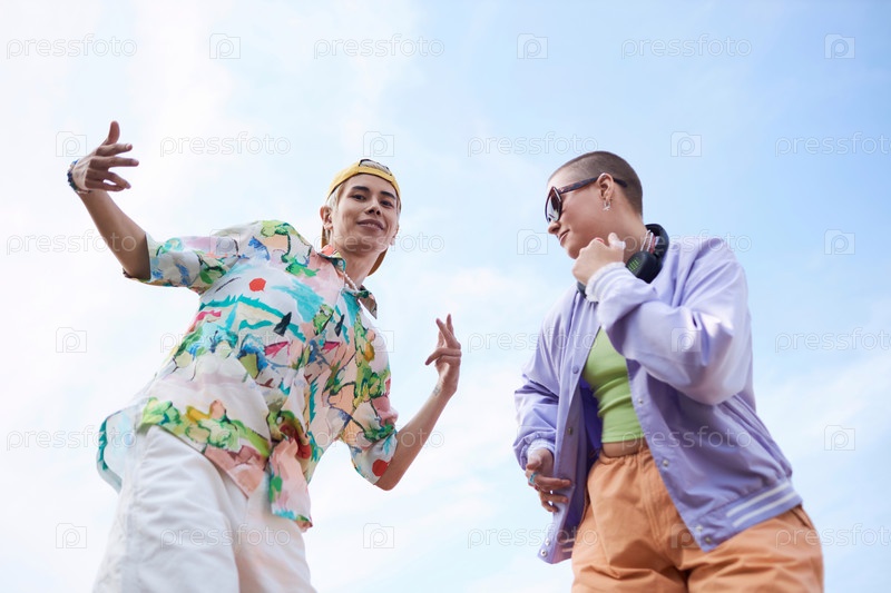 Как минимум два молодых человека танцуют на ясном голубом небе и смотрят в камеру