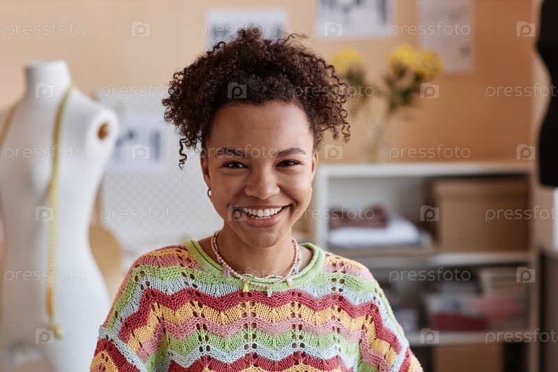 Молодая улыбающаяся модельера смотрит на камеру в мастерской