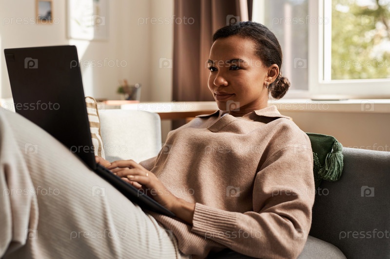 Элегантная чернокожая женщина использует ноутбук на диване, расслабляясь дома в выходные