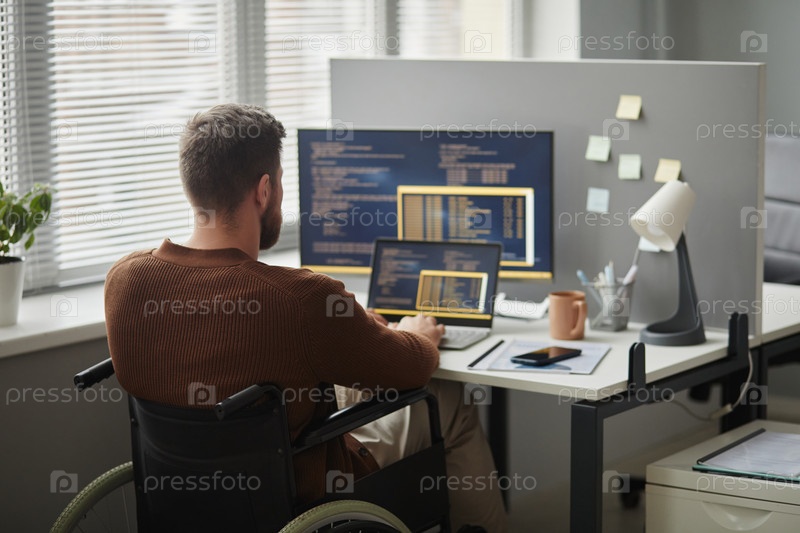 Back View Человек с инвалидностью как профессионал, использующий компьютер