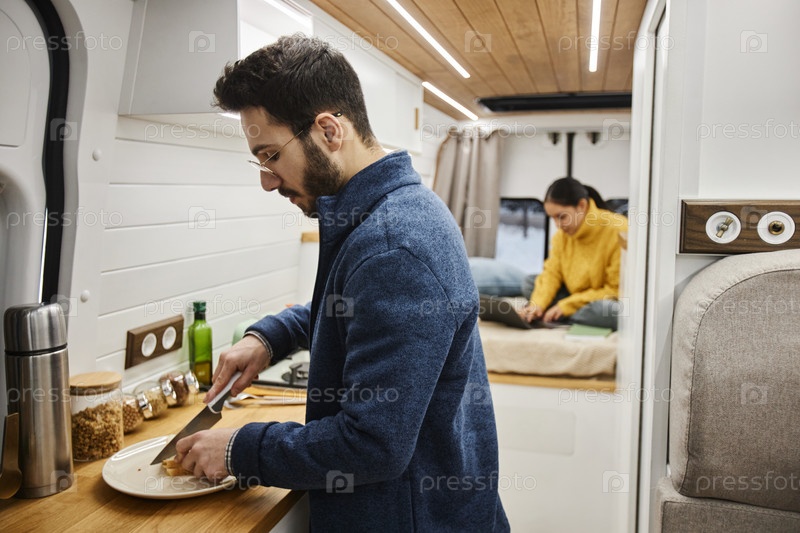 Бородатый молодой человек готовит ужин в фургоне с трейлером, наслаждаясь жизнью на дороге