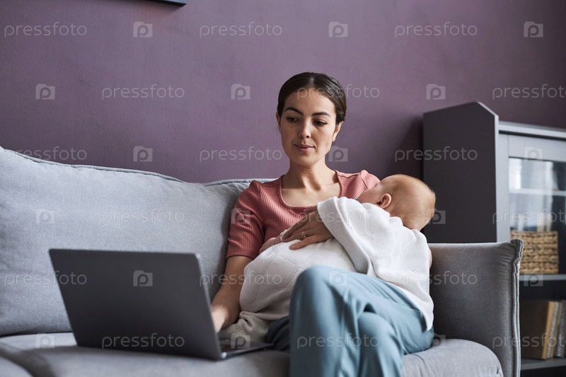 Женщина держит спящего ребенка в руках и использует ноутбук