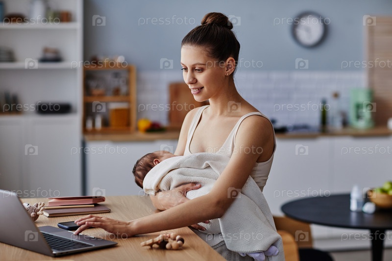 Рабочая мама держит новорожденного в одеяле