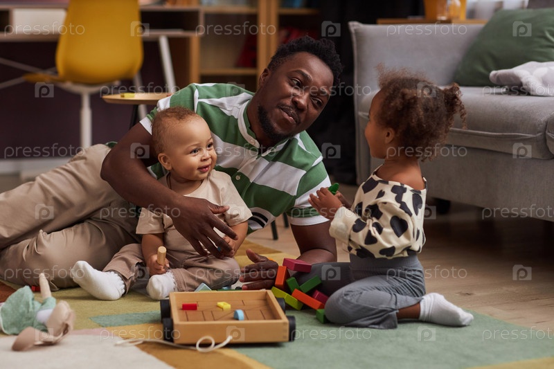 Счастливый чернокожий отец с двумя детьми дома, играющими вместе в игрушки