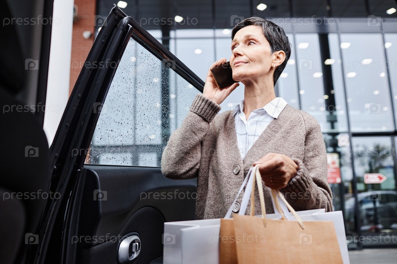 Улыбающаяся женщина с бумажными пакетами, разговаривающая по телефону в машине за пределами торгового центра