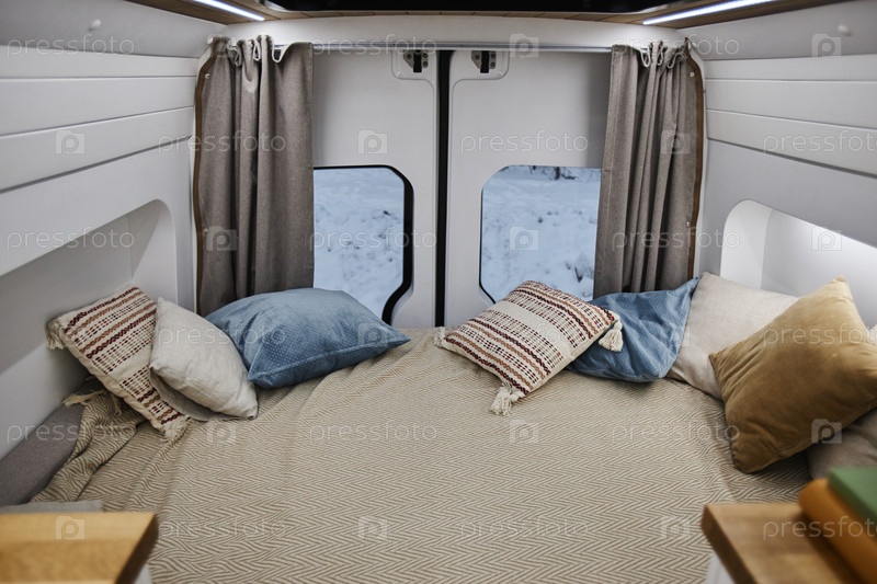 Минимальный трейлер фургона с интерьером с кроватью и уютными подушками