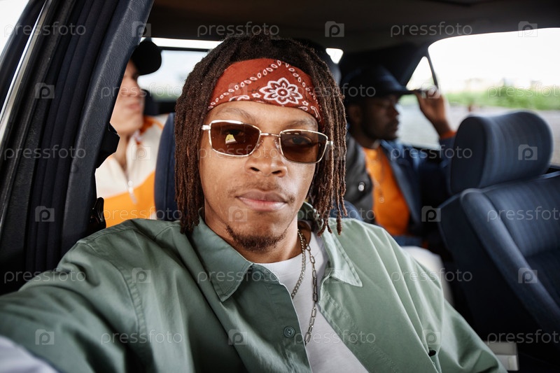 Серьезный афроамериканский парень с дредольками сидит у окна в машине