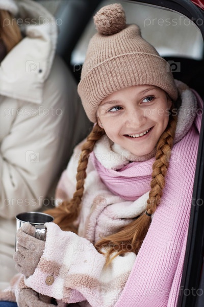 Улыбающаяся красивая девушка в зимней одежде смотрит в сторону, сидя на хэтчбеке