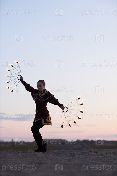 Женщина, выступающая в качестве исполнителя пожарного шоу, одетая в костюм и танцуя на природе