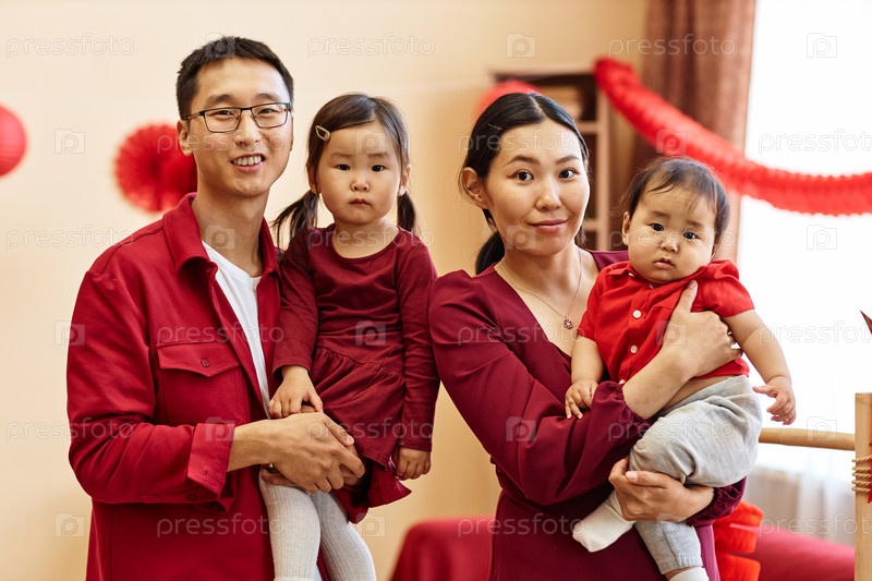 Счастливая китайская семья из четырех человек смотрит на камеру