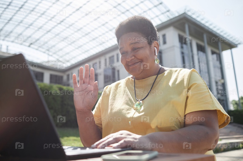 Зрелая чернокожая женщина, размахивающая в онлайн-встрече, работает с ноутбуком на открытом воздухе
