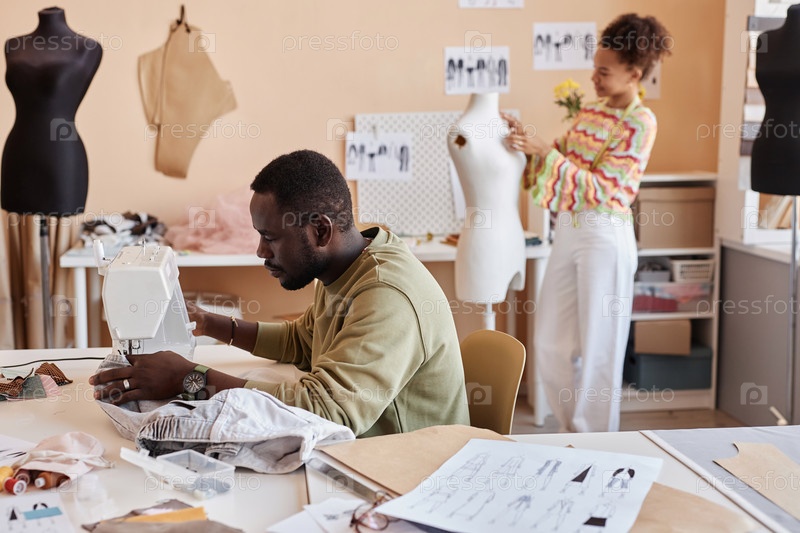 Молодой мужской модный дизайнер шит новую одежду на электрической машине