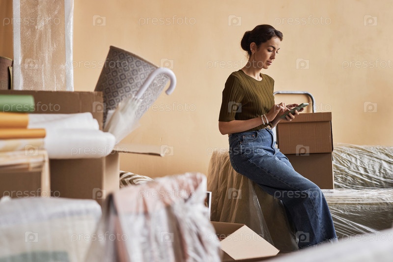 Молодая брюнетка в повседневной одежде отправляет сообщения со смартфонами в гостиной