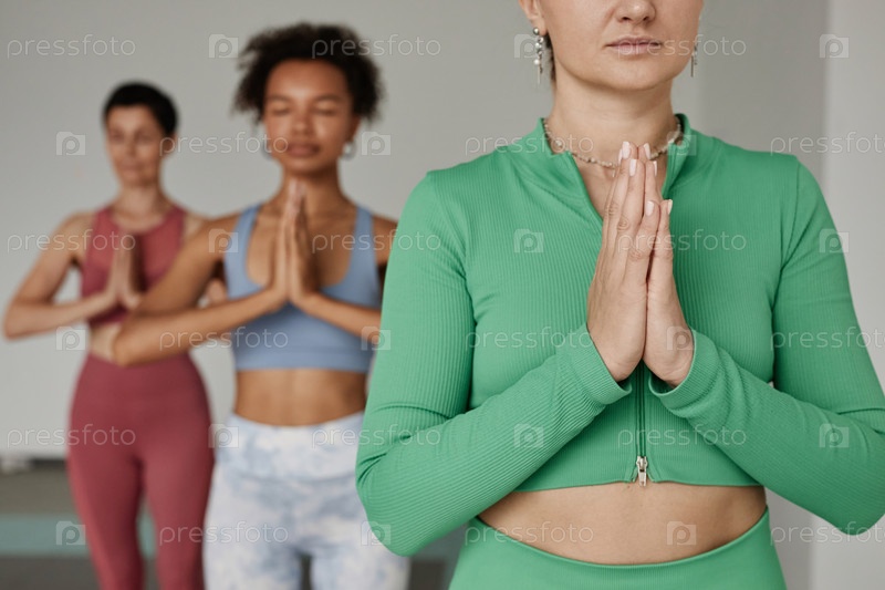 Ближайшее изображение трех молодых женщин с зажатыми руками, медитирующих в студии йоги