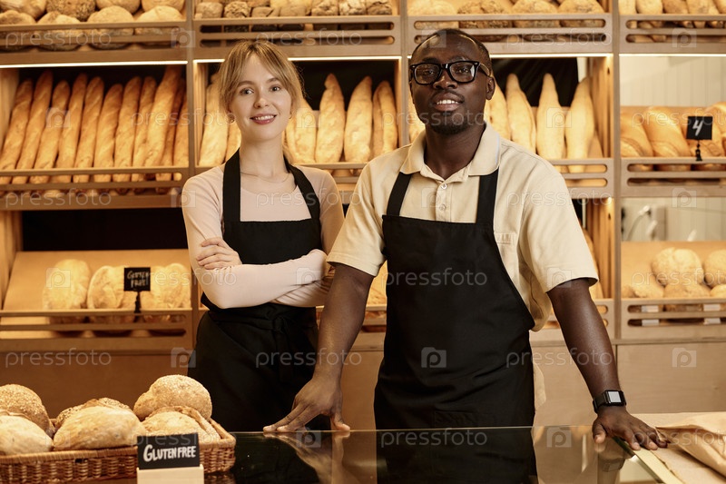 Двое молодых рабочих в ремесленной пекарне стоят за прилавком и улыбаются