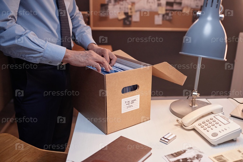 Близкий план детектива, который просматривает файлы на столе в офисе