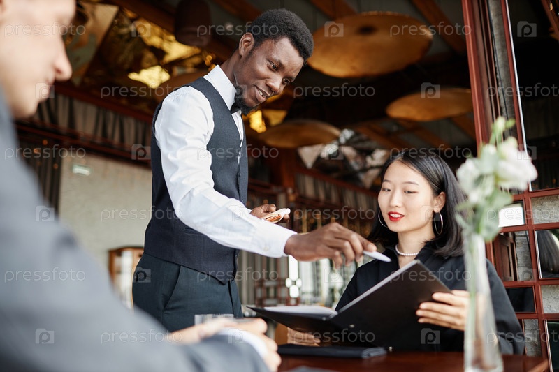 Сервер указывает на меню в роскошном ресторане