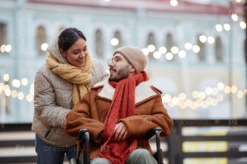 Мужчина в инвалидном кресле наслаждается свиданием на открытом воздухе на Рождество
