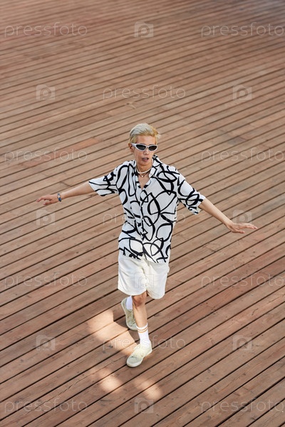 Широкий угол молодого азиатского мужчины, танцующего хип-хоп на деревянной палубе в городе