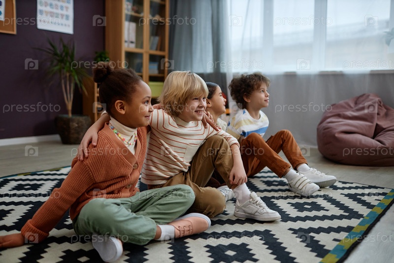 Разнообразная группа маленьких детей, сидящих на полу в дошкольном классе