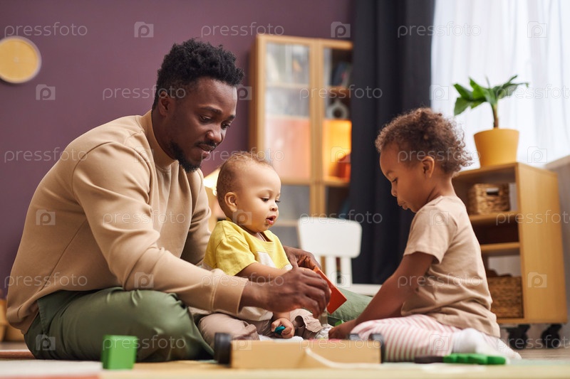 Заботливый чернокожий отец играет с двумя детьми дома и наслаждается отцовством