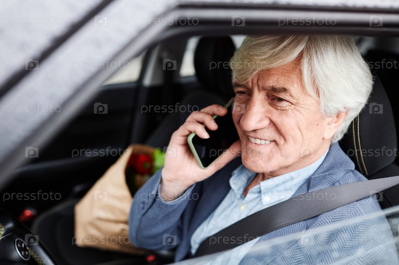 Улыбающийся старший мужчина разговаривает по телефону и водит машину