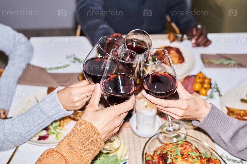 Близкий снимок группы друзей, приносящих тосты за красными бокалами вина за обеденным столом
