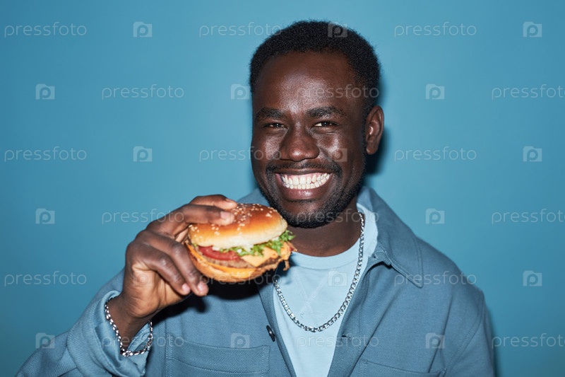Веселый молодой чернокожий мужчина держит бургер