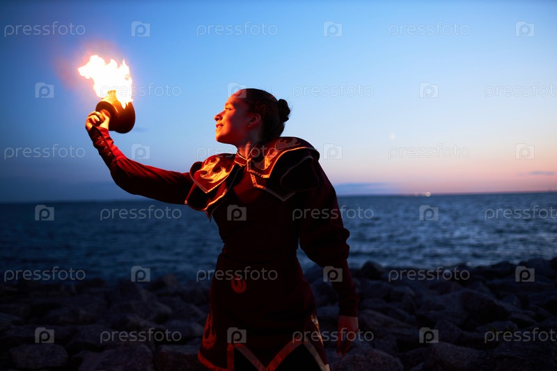 Женщина, танцующая племенный танец с огнем на ночном небе