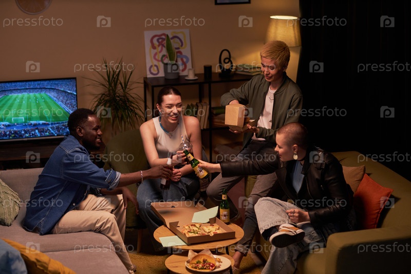 Различные друзья празднуют у себя дома