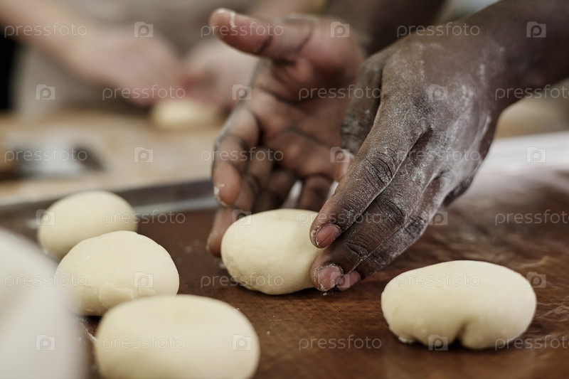 Близкий снимок мужских рук, тщательно формирующих булочки с тестом, работающие на кухне пекарни
