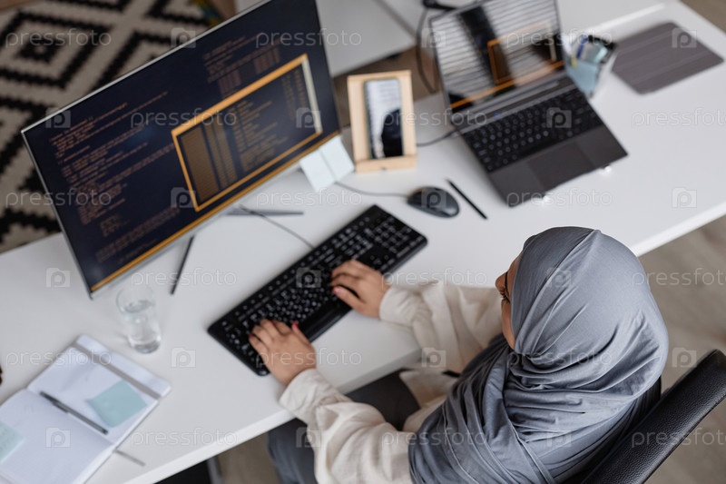 Мусульманская женщина кодирует с помощью нескольких компьютерных устройств