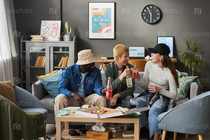 Счастливые молодые друзья разговаривают и пьют газировку