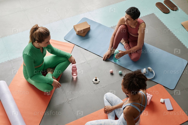Инструктор по йоге сидит на полу с группой женщин в Йога-студии