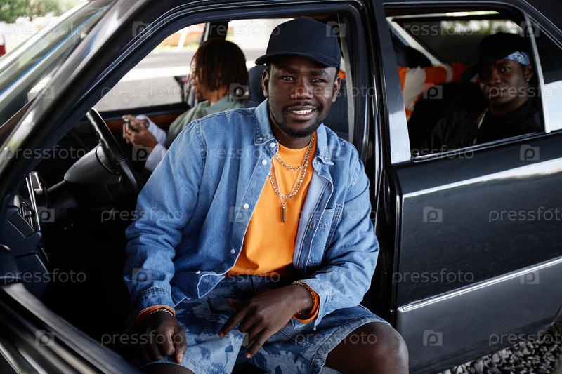 Молодой улыбающийся танцор хип-хопа в черной шляпе, джинсовой куртке и шортах
