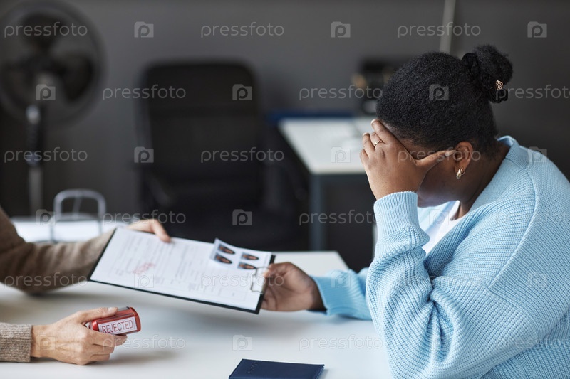 Боковой вид расстроенной женщины-заявителя, которая возвращает заполненный формат заявления на визу