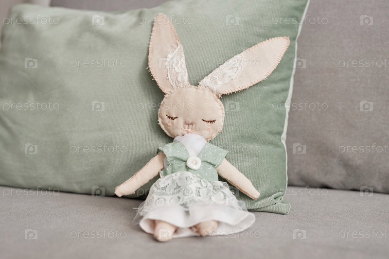 Ручно сделанная игрушка кролика сидит на диване и носит кружевное платье
