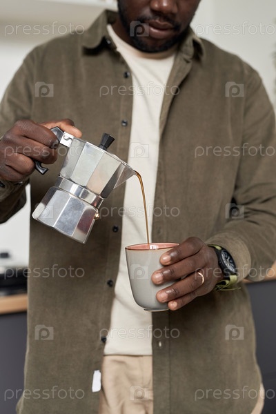 Близкий снимок афроамериканского мужчины, готовящего чашку вкусного кофе дома