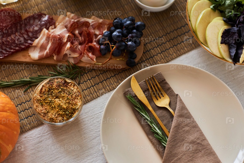 Close up pf элегантная обстановка места с золотыми посудами на обеденном столе