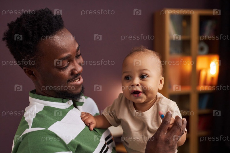 Счастливый чернокожий отец держит милого мальчика в домашней обстановке и наслаждается воспитанием детей