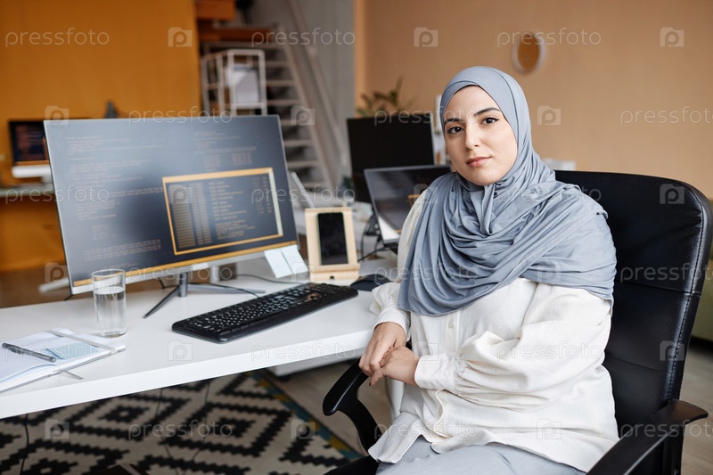 Мусульманская женщина как ИТ-программистка на рабочем столе с компьютерами